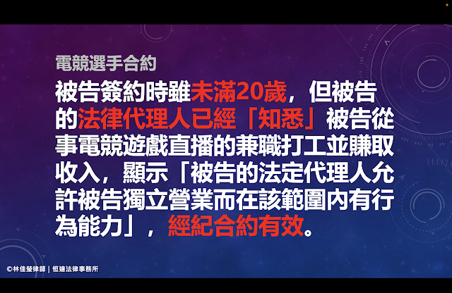 又依被告法定代理人即本件訴訟代理人蔡O霖於本件自陳,於兩造簽立系爭合約前,蔡O霖已知悉並同意被告以電競、遊戲直播作為「另類兼職打工」以「賺取收入」,其後並不再過問,堪認被告法定代理人已允許被告得以電競、遊戲直播獨立營業,被告亦確實以此為業,依民法第85條第1項規定,被告就與電競、遊戲直播等營業有關之事務,有行為能力,兩造簽立之系爭合約自為有效。