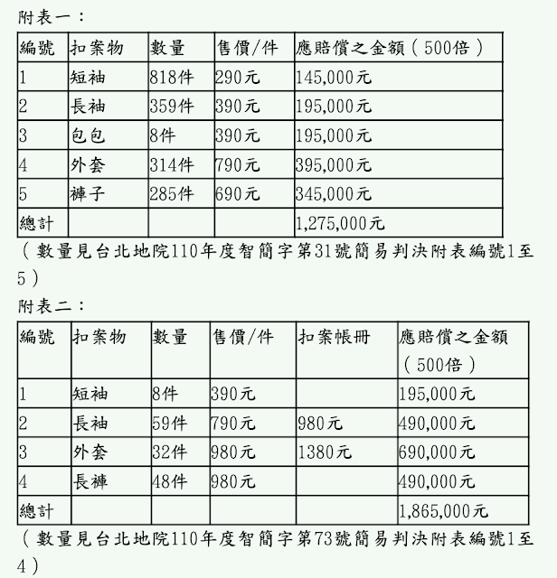 查本件查獲如附表一、二所示之侵害系爭商標之商品,而被告黃信穎前曾於上開刑事案件警詢中分別陳述如附表一、二所示之金額,惟附表二編號2、3部分,經比對上開刑事案件扣案帳冊顯示長袖應為980元,外套則為1,380元,被告黃O穎亦於本院審理時表示就帳冊之記載無意見等語,是附表二編號2長袖及編號3外套之售價自應以扣案帳冊之記載為準。