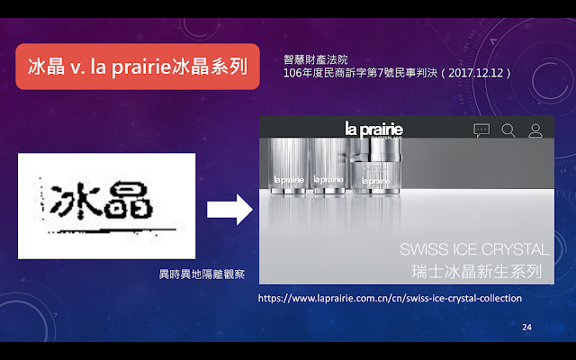 4.訴外人瑞士「LA PRAIRIE」公司即蒲拉利製造廠股份有限公司曾分別於95年7 月16日及103 年2 月16日向經濟部智慧財產局註冊「ICE CRYSTALS」及「CELLULAR SWISS ICECRYSTAL 」等英文字樣之商標名稱,並用於「商品類別003 」即化妝品、保養品類之商品。