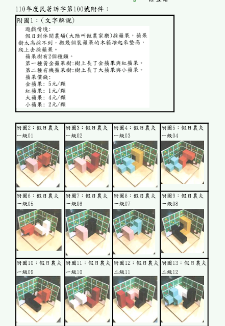 ㈡原告主張:「『果子森林』益智玩具包含遊戲題目及積木本身,遊戲題目又包含遊戲劇情框架及積木擺放方式圖形,遊玩者可透過遊戲劇情將8顆形狀不同之積木,依據情、任務需求,以不同之排列組合方式擺放,並依據積木與遊戲站立介面所接觸之方格計算得分,『果子森林』之劇情及文字題目,均為原告等透過文字敘述劇情框架、場景與任務,其文字整體具有故事連慣性,且足以完整表現著作之思想與感情,具原創性及創作性,屬語文著作;『果子森林』之積木本身與積木擺放方式圖形,透過為圖之形狀、線條、顏色設計等製圖技巧,呈現著作之思想與感情,亦具原創性及創作性,屬圖形、美術著作」云云。