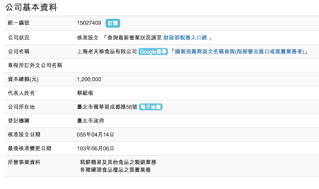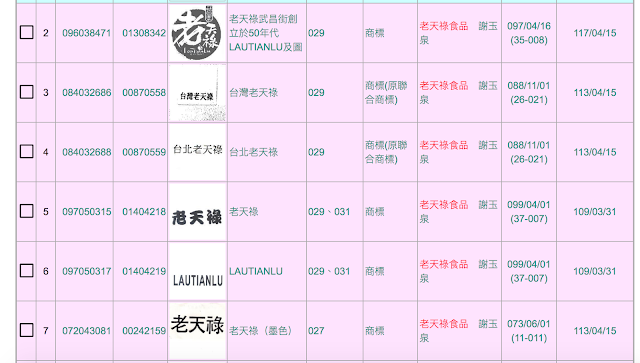 「上海老天祿第一代」應該也就是「上海老天祿食品有限公司」是在55年成立,所取得的註冊商標多是註冊在「糕餅類」,確實沒有「滷味類」,而且註冊日期大概是97年以後(唯一一個比較早的是76年的商標但僅註冊在「調味料」)。