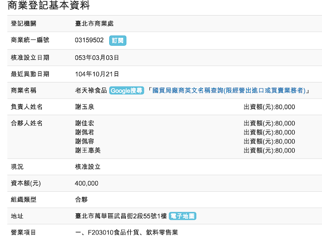 相較之下,原告「老天祿食品行」是在53年成立,自73年、88年就已經取得在「滷味類」的「老天祿」(還有「台灣老天祿」「台北老天祿」)商標。