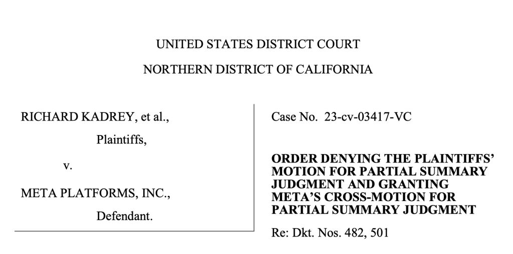 法院認為,儘管 LLM 訓練具有高度潛力造成市場稀釋(間接替代),但由於這十三位原告未能提供足夠的證據來證明這種損害已經發生或即將發生,因此法院只能根據現有記錄,裁定合理使用抗辯成立,並判決 Meta 在該特定訓練複製行為上獲得簡易判決勝訴。此判決不代表 Meta 使用受著作權保護材料來訓練 LLM 是合法的,僅表示這幾位原告「提出了錯誤的論點,且未能就正確的論點提出支持證據」。