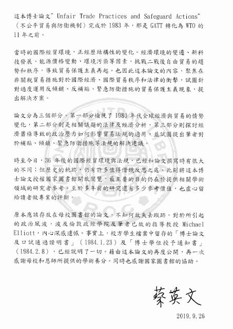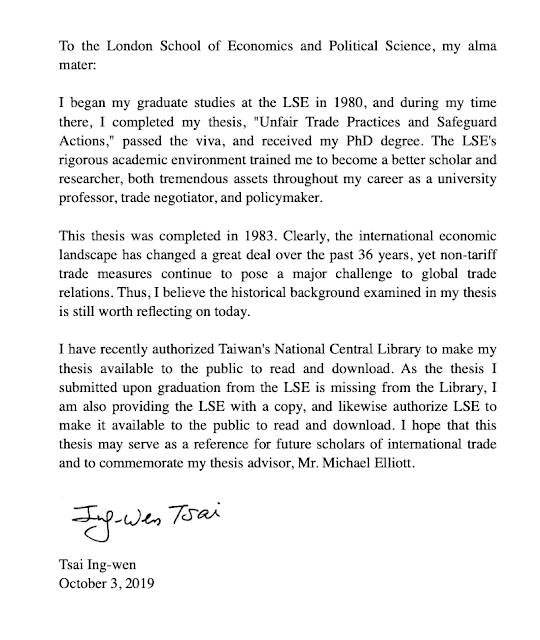 2.LSE正式發佈官方聲明「蔡英文確實有將論文提交到圖書館,也取得博士論文學位」。