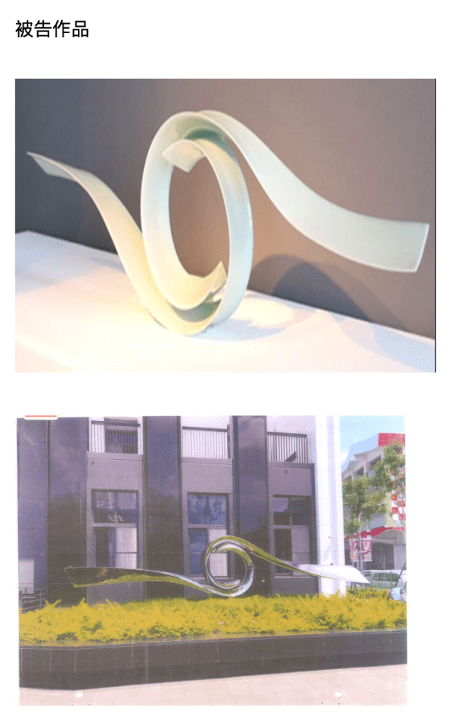 3、原告主張被告作品係重製系爭作品而來,依被告等提出被告作品完工照片與系爭作品整體比對觀之,可知系爭作品以半圓互扣,二側向左右緞帶狀延伸傾斜,二側之末端有稍微翻轉之線條,且未對稱,整體為前薄後厚之作品,而被告作品亦均有前開特徵,就一般理性閱聽大眾觀看角度而言,二者之「整體觀念與感覺」為高度近似,已達到實質相似之程度(詳如附表),是原告主張被告作品係重製系爭作品而來,應屬有據而堪採信。被告等雖抗辯被告作品材質為不鏽鋼,且尺寸大小與系爭作品不同,二側緞帶式延伸長度、彎曲亦有不同云云,惟被告作品與系爭作品之設計及外觀呈現幾乎全然相同,業經本院說明如前,被告等所辯前述些微差異部分並未影響被告作品與系爭作品於整體觀察上構成實質近似之事實,是被告等前開辯解,尚難採憑。被告復抗辯其未曾接觸系爭作品,其有獨立創作能力乃獨立完成被告作品云云,惟細譯被告提出其個人創作簡介及相關展覽,被告之創作多為攝影展,其餘關於線條之圖片或公共藝術均與系爭作品或被告作品外觀上顯然不同,佐以被告投標系爭標案所檢附之簡介,就其個展、主要聯展部分確多為攝影展,則被告是否確有獨立創作被告作品之能力,尚非無疑。